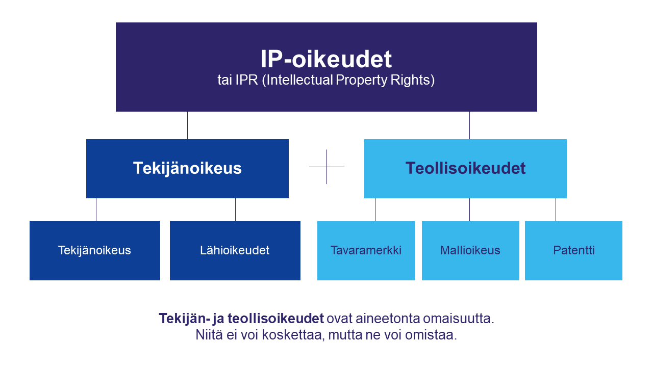IP-oikeudet suojaavat luovaa työtä sekä ihmisten kehittämiä tuotteita, palveluita ja innovaatioita. Niillä suojataan yksilöiden ja yritysten aineetonta omaisuutta, jota ei voi nähdä tai koskettaa. Tällaista omaisuutta ovat esimerkiksi keksinnöt, tavaramerkit, muotoilu sekä luovat teokset, kuten musiikki, kirjat, taideteokset, elokuvat ja valokuvat. IP-oikeuksiin viitataan usein kirjaimilla IPR, mikä on lyhenne englanninkielisistä sanoista Intellectual Property Rights ja millä tarkoitetaan kirjaimellisesti henkisen omaisuuden oikeuksia. Oikeudenalana niihin viitataan myös termillä immateriaalioikeus.