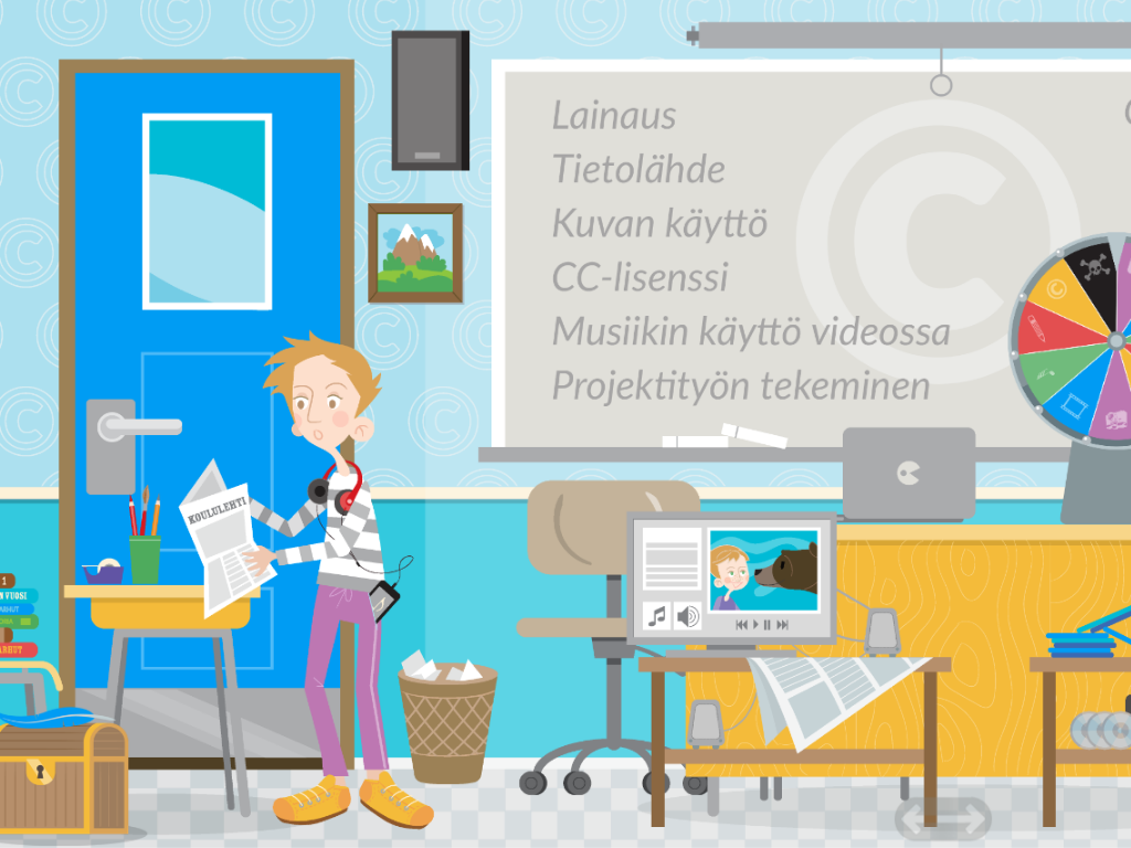 I klassrummet för årskurs 3–4 hittar du ett roligt lyckohjul samt en mysterielåda. Bakom de gungande föremålen finns också uppgiftskort och minnestavlor om upphovsrättigheternas centrala teman när man själv är upphovsman.