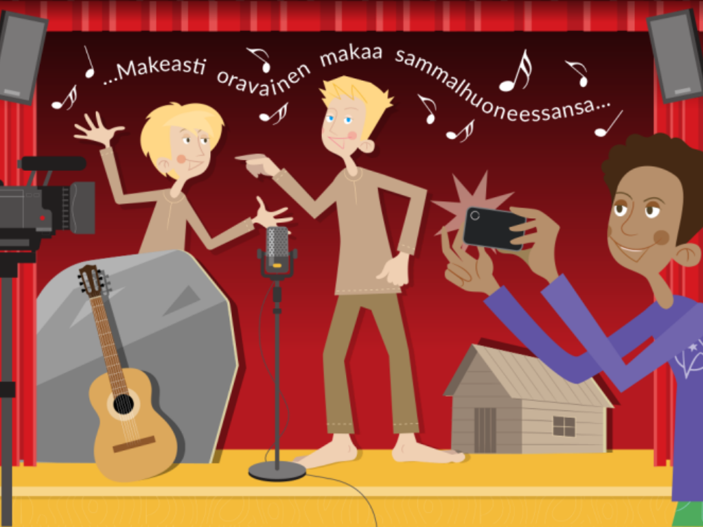 I musikalspelet gör eleverna en musikal. Vilka upphovsrättsfrågor måste beaktas? I spelet träffar man på situationer som har att göra med upphovsrättigheterna. Utgående från de val du gör får du veta om musikalen är en framgång eller en total flopp.